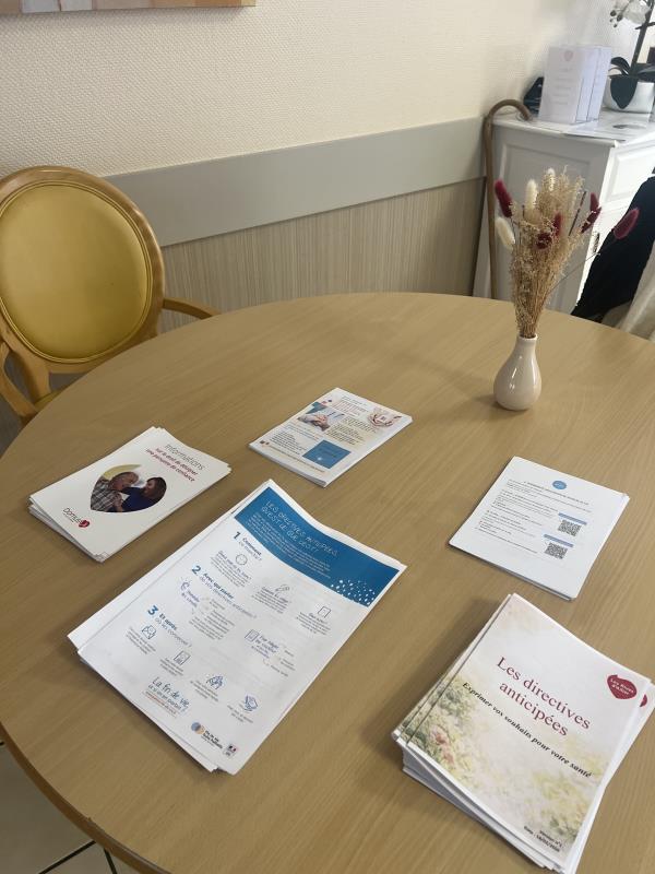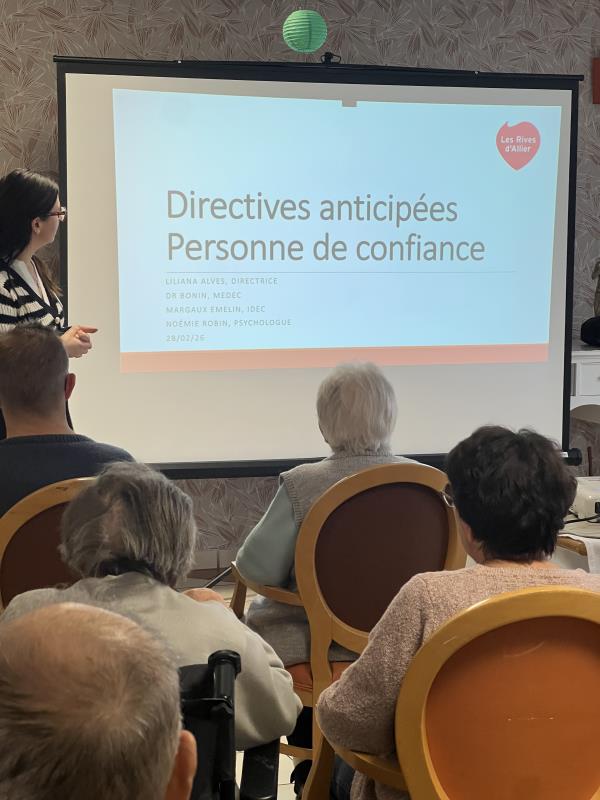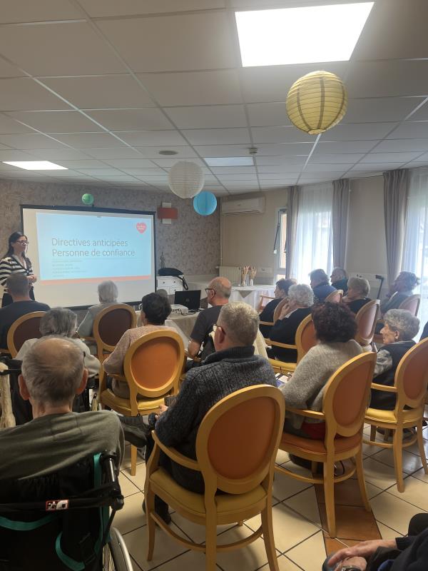 Plusieurs résidents, accompagnés pour certains de leurs proches, ont participé à cette rencontre animée par Dr Juliette Bonin, médecin coordinateur, Noémie Robin, psychologue, Margaux Emelin, infirmière coordinatrice, et Liliana Da Costa Alves, directrice de la résidence. Les notions de fin de vie, les modalités de rédaction des directives anticipées ainsi que le choix de la personne de confiance ont été présentées et expliquées. Il s’agit d’éléments clés pour garantir une prise en soins respectueuse des souhaits de chacun.