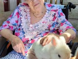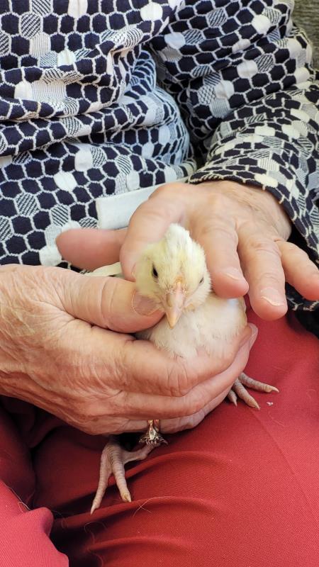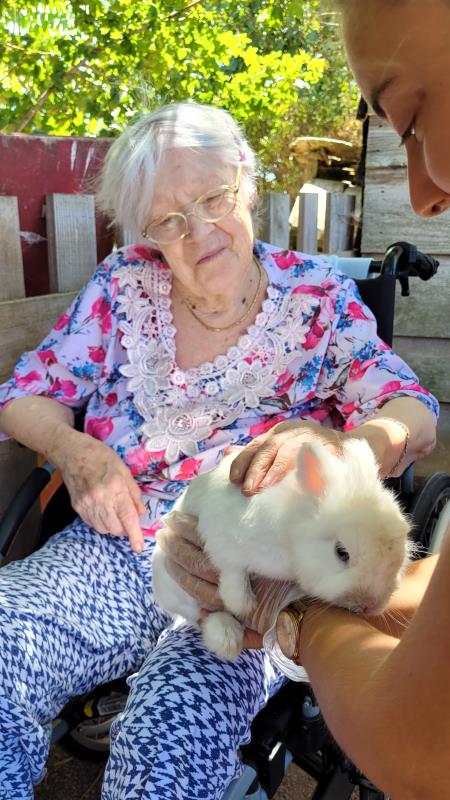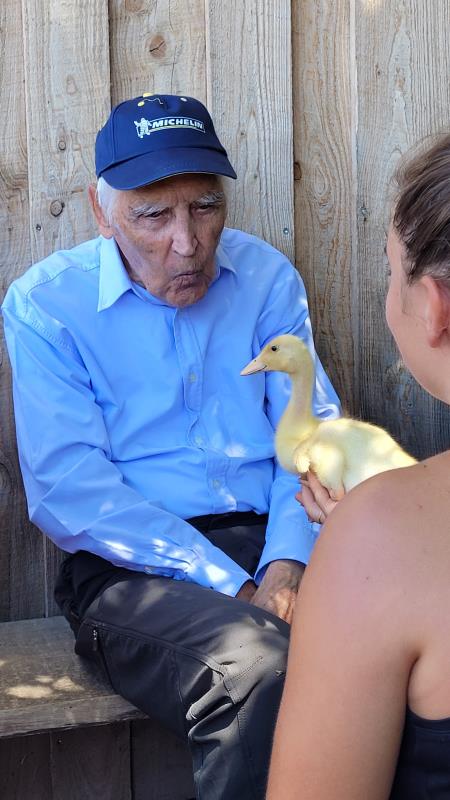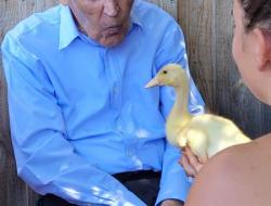Puis nous avons poursuivi notre aventure par une séance de médiation animale au cours de laquelle nous avons fait la connaissance « très rapprochée » de nombreux animaux : la chèvre Chaussette baptisée ainsi en raison de ses pattes à 2 couleurs, l’agneau Pinceau appelé ainsi en raison de la forme de sa queue, il a aimé chahuter avec M. M. (et vice-versa), 2 cochons d’Inde, Chouchou qui a eu droit à une séance de coiffage par Mme L. et Riri qui a apprécié les caresses prolongées de Mme P. ; Olaf le lapin nain, un poussin et Saturnin le canard qui a tenu la conversation à M. F. qui s’est amusé à lui répondre en sifflotant.