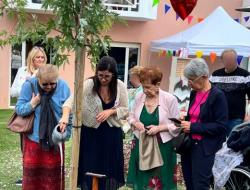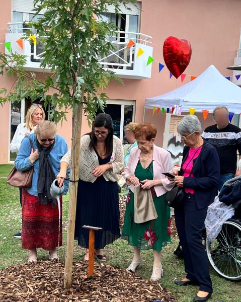 Partage du gâteau accompagné de petites bulles suivi d’une tombola avec remise de cadeaux, l’après-midi s’est conclu par la plantation d’un érable qui marquera cette belle journée festive. La directrice et 2 résidentes ont dévoilé une plaque, et arrosoir en main ont versé de l’eau au pied de l’arbre en lui souhaitant une belle croissance.