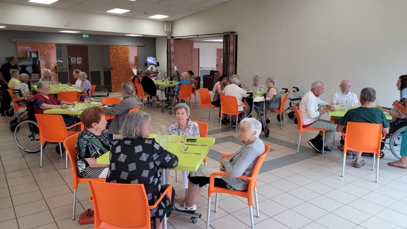 A notre arrivée à Culhat, les sourires étaient sur les visages de tous les résidents heureux de se retrouver 15 jours après leur précédente rencontre à la Résidence Les Rives d’Allier. Toutes et tous se sont installés dans la salle polyvalente du rez-de-chaussée pour partager le déjeuner. Dressage des tables, service de l’apéritif, les « amis réunis » ont trinqué à leurs retrouvailles.